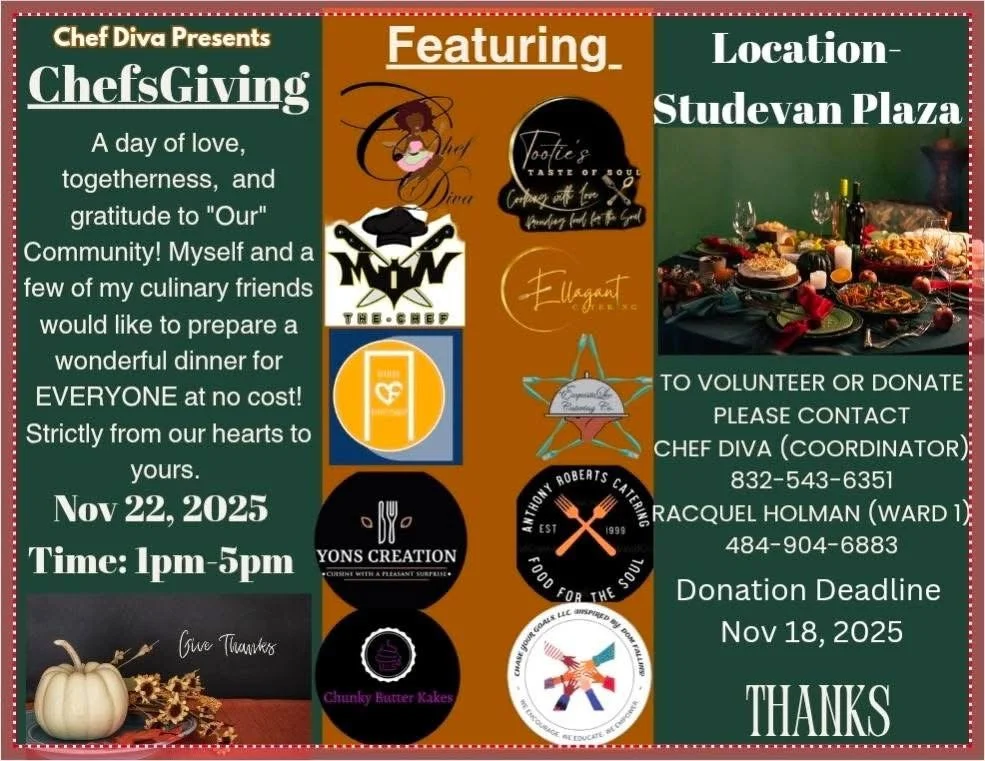 Join Chef Diva and others for a ChefGiving Event this Saturday, November 22, 2025, from 1–5 PM — come share a warm, free Thanksgiving meal with the community.